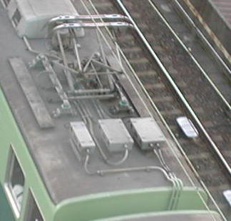 6000系のみに見られる京都側パンタグラフ付近です。上の写真の京都側の続きとお考え下さい。非常に見にくく申し訳ありませんが避雷器が撤去後のものです。パンタ下から4本出ている配管の内左から3本目が避雷器からのアース管でそのまま残されています。