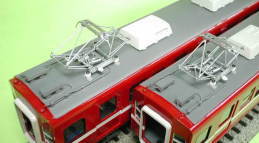パンタ周りです。この車両は配管が妻板に降りず屋根上で車体に入り込みますので楽な方でした。('03,10,1) |
