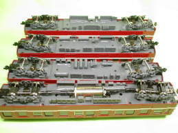 下回りです。浦和向き先頭車にLN−14モーターとMPギアによる駆動方式です。ウエイトは床下機器取り付け台を鉛板にするパターンで行きました。('03,10,1) |