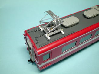 中間車の屋根上です。製作記にも記しましたが、パンタグラフは取付台の形態からKATOのアーバンライナー用を利用しています。 |
