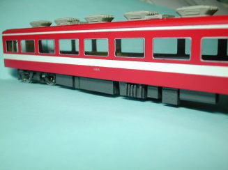 上の車両の床下機器です。ワムさんからロスト製の素晴らしいパーツが発売されていますがこちらはKODAMA製の純製ホワイトメタル製です。写真では良く写っていませんが車側表示灯はモデルエイトのパーツを取り付けています。 |