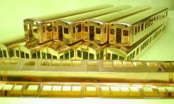 さすが10連ともなると妻板16枚、ドアだけでも60枚とうんざりします。以前の製品にに比べ前面パーツの表面がかなり荒れています。この金型を使った製品もそろそろ見納めかなという気がしてきました。半田付け前に充分整形し接合部分もガラス板の上に敷いた耐水ペーパーの上で先頭部分の方を動かして平にします。('01,3,4) |