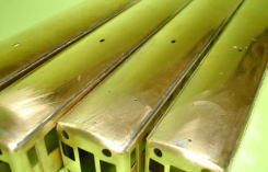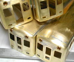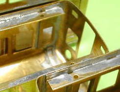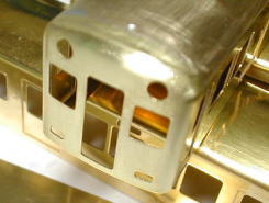 アングルを取り付け前面の継目を修正します。谷川のキットに比べ真鍮が薄手ですのでしっかりと平面性が保てるようにアングルの取付にも気を配ります。続いて前面運転室窓ですが実車ではアルミによるはめ殺しになっています。模型では洋白のアルミパーツを貼るようになっていますが前面側には左右ともHゴムの表現がされています。実車のほとんど面一なところを表現する為これを削り取ってしまいます。写真がその状態です。('01,3,9) |